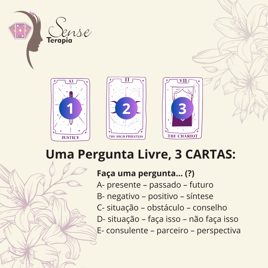 Você tem uma dúvida que precisa de uma resposta rápida e objetiva? A leitura de tarô Uma Pergunta Livre é perfeita para isso! Escolha o assunto que mais lhe preocupa e receba orientação personalizada, com a opção de escolher como prefere receber a resposta, das opções A até E. Além disso, conte com o auxílio de uma profissional terapeuta para formular sua pergunta de forma mais assertiva.